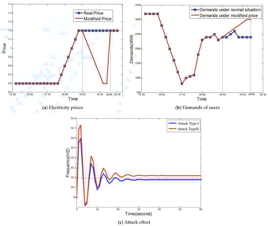 Next, we illustrate that reverse demand attacks mainly based on Attack Type II can achieve a better impact than fast attacks mainly based on Attack Type I. The parameter α of this piece of disinformation is 0.5. In Figure 14, we see that sometimes, Attack Type I with α = 0.5 cannot cause the disconnection of generators. In Figure 16, we show the impact of Attack Type II with α = 0.5. Attackers modify the power price from 18:50 to 20:00. Figure 16a describes the real prices and modified prices over time. Figure 16b describes the demand changes for real prices and the modified price, respectively. Compared with the demands under the normal price, the demands of users under power price modification attacks gradually increase. During the process, the frequency of the power grid keeps invariant.