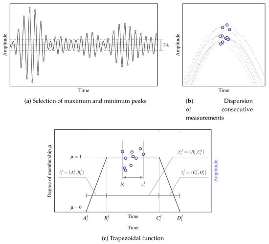 Mathematically, the evaluation within the previously established trapezoidal function (or set) of CP, namely the i-th CP of the j-th signal, , , will provide the degree of membership of such a point to the set, which is defined as follows: