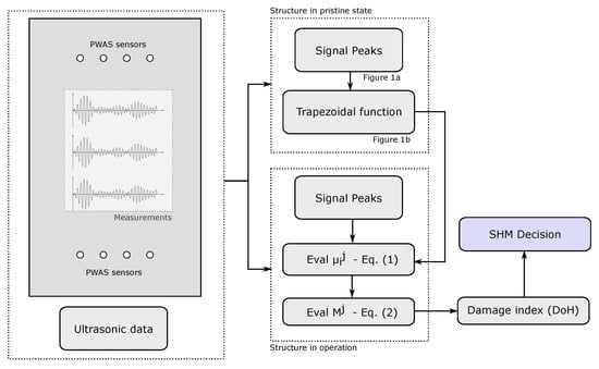 Note that the function , conservatively chosen in this paper as the minimum of the degrees of membership, might be adopted differently such as the weighting and segmentation of the ToF or the amplitude []. Note also that in Equation (2) the function has been subtracted from the unity, consequently, M can be viewed as a damage index which increases as the defect becomes more severe, and vice versa. Moreover, when a set of ultrasonic signals are available and post-processed by this method, an array (or matrix) of M values rather than a single value can be obtained. The use of additional M values ultimately leads to a more reliable monitoring since the influence of sensor malfunctioning in the monitoring decision greatly decreases. In this case, the resulting array or matrix is referred here to as the DoH matrix of a structure, with values from 0 (maximum health) to 1 (maximum degradation). A schematic workflow of the proposed methodology is shown in Figure 2.