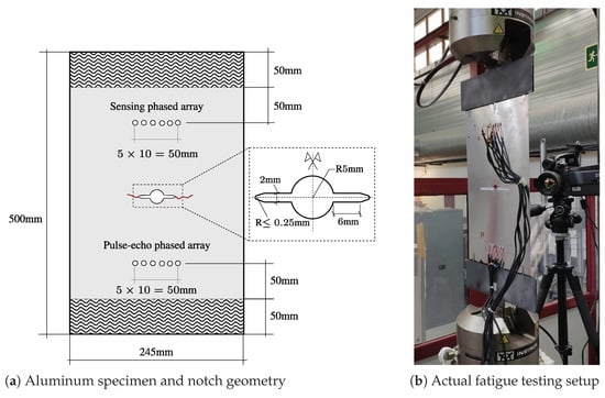 Panel (a): Schematic of the specimen and notch geometry, along with the position of the piezoelectric wafer active sensors (PWAS) arrays. Panel (b): Picture of M(T) aluminum specimen with two permanently attached phased-arrays mounted on the fatigue testing machine.