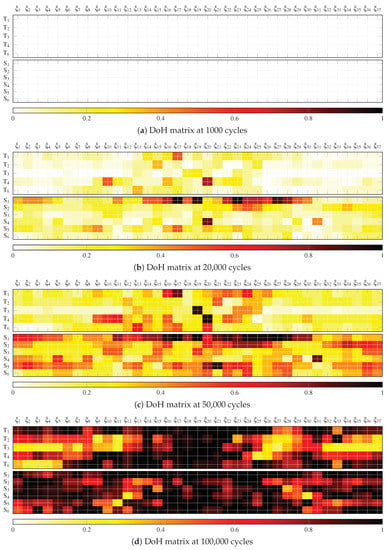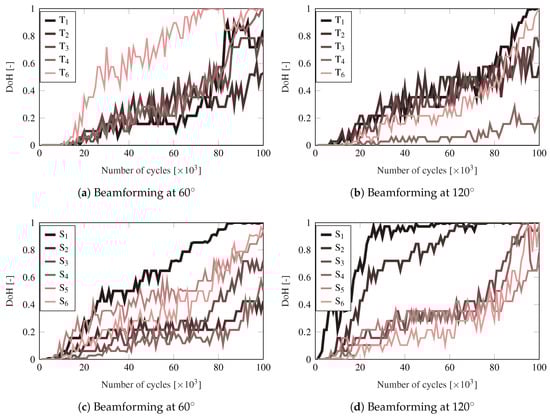 Figure 6a–d show the DoH matrix of the signals acquired at different fatigue cycles, namely 1000, 20,000, 50,000, and 100,000. Note that two DoH matrices are provided for each dataset, the one on the top is for the pulse-echo array (using T PWAS) and the one on the bottom is for the pitch-catch array (using S PWAS). As is evident from the results, a clear degradation of the structure is appreciated by the increase of the DoH damage index when increasing the number of cycles.
