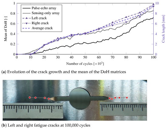 Notwithstanding, working with the DoH matrices may be limited in practice due to their complex interpretation. Hence the mean value of M (i.e., all the values of the DoH matrices), is used here as a simplified statistic of the SHM data evolution, as shown in Figure 7a. Results also show that a higher damage index value is obtained using the data acquired in the S sensors (grey line) compared to the T sensors (black line). Furthermore, a comparison of the evolution of both the DoH index and fatigue crack length is also depicted in Figure 7a. The measurements of the crack length are obtained by digitizing different points in the crack path, as shown in Figure 7b. A remarkable agreement in the trend of both damage indicators is observed throughout the duration of the fatigue test. Note also that the early damage is detected using the two phased-arrays around 10,000 cycles, although the S sensors are able to provide an earlier indication of damage (i.e., even before it is visible by optical means).
