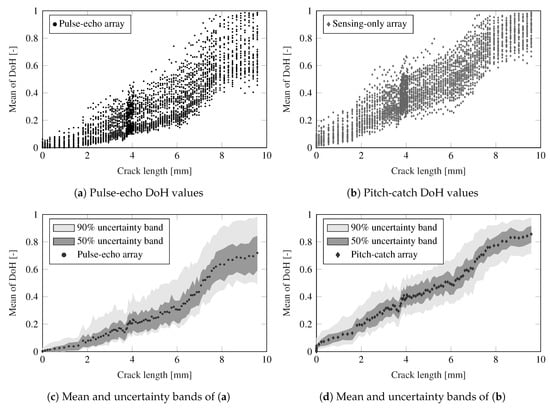 Relationship between crack growth and mean of DoH for both pulse-echo and pitch-catch working modes. Panels (a,b) provide the data for the 37 directions with an average value of DoH with respect to the PWAS in the array. Additionally, (c,d) show the mean and 90% and 50% uncertainty bands of the DoH data.