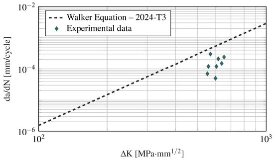 where and denote the crack length and the number of cycles of the n-th point, respectively. Given that the crack growth rate is an average over an increment (), the average crack size is adopted to calculate []. Thus, the crack growth rate along with the stress intensity range are obtained from the experimental results and are shown in Figure 10. These data are compared to the Walker crack growth equation [] adopting the parameters for a 2024-T3 clad and bare aluminum sheet, L-T (M2EA11AB1) []. It is noticeable from Figure 10 that the fatigue properties obtained from the experiments are relatively close to those available in the literature, considering the high variability that is typically manifested in fatigue tests []. This similarity is obtained even though (1) the fatigue tests do not strictly follow the ASTM E647 recommendations in terms of specimen aspect ratio; and (2) the data from the Walker equation is for an aluminum material with a different heat treatment than the one used in the tests.