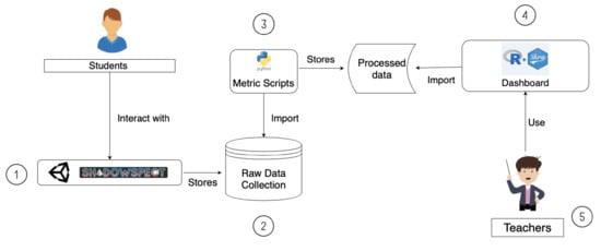 In Figure 1 we can see the complete process of our work from the students interacting with the game to teachers using the dashboard developed. Let us see each step in detail: