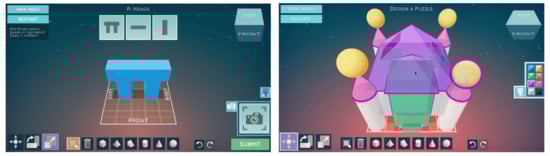 When students begin a puzzle, they receive a set of silhouettes from different views that represent the figure they need to create, which will be composed of other primitive shapes the student can put into the scenario. The primitive shapes that students can create are cubes, pyramids, ramps, cylinders, cones, and spheres. Depending on the level and difficulty, the puzzle may restrict the quantity or type of shapes they can create. After putting these shapes in the scenario, they can also scale, move, and rotate the shapes in order to build a figure that solves the puzzle. Students can move the camera to see the figure they are building from different perspectives and then use the “Snapshot” functionality to generate the silhouette and see how close they are to the objective. Finally, they can submit the puzzle and the game will evaluate the solution and provide them with feedback (see a demo online []).