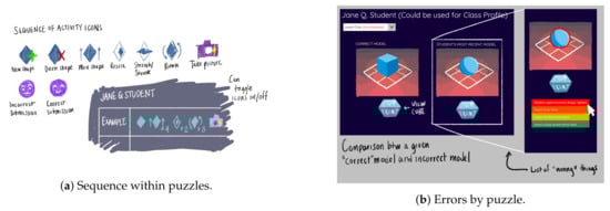 Our work has focused on developing metrics and visualizations, but we have not delved into explaining two other key elements of pedagogical learning analytics design []. The first one is related to establishing a connection between the learning analytics and the learning activities that will be performed by students. The second one is related to how the users (students or teachers) will use the chosen analytics as part of the learning activities. In our case scenario, teachers will be using the analytics and visualizations while students solve geometry puzzles within Shadowspect at home or in class, in order to facilitate intervening when appropriate. Moreover, based on the information provided, teachers can actively influence the game-based learning activities in order to improve students’ learning outcomes [].