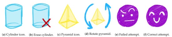 Moreover, in order to generate representative visualizations, we have also developed some icons that match the different shapes and manipulation events that a student can make through the game. In Figure 4 we can see some examples of the primitive images (Figure 4a,c) that have been used to create composite images taking into account the possible actions that can be made with each shape. For example, in Figure 4b we can see how the deletion of a cylinder is represented. Another example is presented in Figure 4d, with the icon exemplifying the rotation of a pyramid. The last two icons that we introduce here represent an incorrect submission of a puzzle (Figure 4e) and a correct one (Figure 4f).