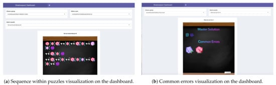 To design the dashboard, as many authors note, we followed the principle that “Everything should be made as simple as possible, but not simpler” []. As this dashboard will be used by teachers, we want to prioritize making visualizations easily interpretable, so that they can use the information provided effectively. We have developed a visualization for each of the two metrics that were defined as part of the previous steps. In Figure 5 we can see a couple of examples of the dashboard visualizations. As we see on the upper part of the image, the teacher can select the different groups, users, and puzzles available with the selection boxes. That is how a teacher can monitor every single student simply using the dashboard and the selection boxes.