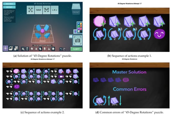 As raw data can contain a large amount of information which is not related to the students’ interaction, it is very important to transform these data into a clean and actionable sequence of actions. While these sequence mining techniques can be used across different contexts, in this research we apply them on educational data to examine the specific processes students follow during the learning process []. We apply sequence mining to analyze students’ sequences of actions while playing the different puzzles included in the game, allowing teachers to monitor each student’s behavior while playing the game as well as the common errors made in the solving process. Besides process and sequence mining, stream data mining [] and knowledge tracing have been used in other studies to track and evaluate students’ behavior over time. Specifically, in knowledge tracing, the cognitive model is used to interpret each student’s action and follow the student’s step-by-step path through the problem space [].