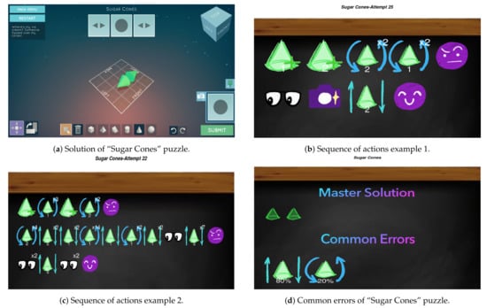 As it is important to make sure that the visualizations are usable by teachers, we will be working on obtaining evidences of the interpretability of these visualizations and their usefulness in real classrooms, as we do not have a validation case study with teachers yet, which we consider as our main limitation. Other works have analyzed the impact of visualizations in the learning process and evaluated the usability and effectiveness of dashboards []. Mazza and Milani [] revealed that graphical representations might help instructors to identify individuals that need particular attention, to discover patterns and trends in accesses and discussions, and to reflect on their teaching practice. Another noteworthy limitation is regarding the algorithmic design to detect common errors. The issue is that puzzles can be solved using multiple combinations of shapes. Therefore, the algorithm focuses on computing the errors of only those puzzles that were solved using the master solution. This is done to avoid adding noise to the teachers due to including data from puzzle attempts that were solved in an alternative way, since the majority of the puzzles were solved with the master solution. Additionally, this limitation does not represent a problem to reapply our methodology to detect errors in other interactive educational environments where there is a single solution.