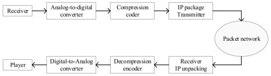 VoIP (Voice over IP), also called IP telephony, is a method and group of technologies for the delivery of voice communications and multimedia sessions over Internet Protocol (IP) networks, such as the Internet. The system includes terminal equipment, gateways, gatekeepers, network management, etc. The traditional telephone network transmits voice in a circuit-switched manner. VoIP uses an IP packet switching network as the transmission platform to encode and compress analog signals, and then package the voice data following the TCP/IP standard and other special processing, so that it can be transmitted using the connectionless UDP protocol. After decoding and decompression processing, it is restored to the original voice signal, to achieve the purpose of transmitting voice through the Internet. The VoIP transmission procedure is presented in Figure 1 [14].