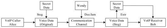 Information hiding technology is also called steganography [1]. The principle is to hide secret information without being noticed by a third party by modifying redundant data in digital media or protocols, such that the carrier’s use attributes are not changed during transmission. By this means, a secret message can be embedded into cover objects and transmitted through public channels [2,3]. At present, it is widely used in transmission media such as voice, image, video, and text. Different types of carriers have distinctive information hiding algorithms. Because human organs are insensitive (for example, the ears are not very perceptive to subtle changes in sound [4]), people are not able to use their senses to discover the difference between the original carrier (the carrier that does not contain secret information) and the secret carrier (the carrier that contains secret information), and they are unable to discover the covert communication. Distinct from encryption technology, steganography technology provides a more reliable and safe method of information transmission by hiding the location and method of embedded information to make the information undetectable to third parties [5,6]. Encryption technology causes the transmitted cipher text to have an obvious sense of “violation”, which is more likely to arouse the alertness of attackers. Once discovered, the attacker can use various approaches and tools such as brute force cracking to destroy the cipher text, which greatly increases the risks with secret communication. In short, encryption technology hides the content of covert communication [7,8], while steganography technology hides the “behavior” of covert communication, so steganography technology is able to provide better concealment and security [9,10]. Table 1 compares the differences between steganography and encryption in five aspects [11].