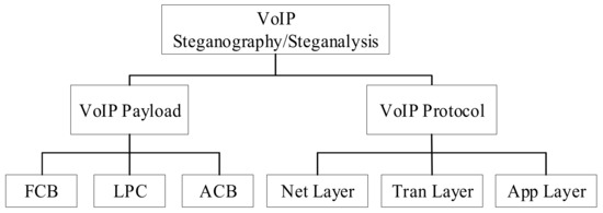 Wojciech Mazurczyk [16] briefly analyzed and summarized the VoIP-based steganography and steganalysis algorithms available in 2003–2012, which is helpful for understanding the work at that stage. This article is a further improvement in terms of classification details and performance comparison with respect to [16], and the literature mentioned in [16] will not be considered. From the existing literature, VoIP steganography methods mainly have two research directions, according to the different steganographic areas: (1) steganography methods using the voice stream payload that is transmitted in real time by the VoIP system as the carrier; (2) network protocol steganography, which uses the network protocol involved in the VoIP transmission process as the carrier. Algebraic code excited linear prediction (ACELP) rule encoding is used in VoIP encoders, and the parameters obtained after encoding include linear predictive coefficient (LPC) parameters, fixed codebook (FCB) parameters, adaptive codebook (ACB) parameters [19], and gain parameters. Because the gain parameter redundancy is too small to embed more secret information, seriously reducing the embedding efficiency, it is unsuitable for steganography. The steganography methods focusing on the voice payload include the first three, or a mixture thereof.
