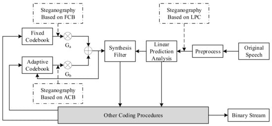 The VoIP steganography distribution diagram based on the voice payload is presented in Figure 4 [24]. This figure describes the coding procedure of speech. First, the original speech signal is preprocessed, and the linear prediction coefficients obtained are converted into line spectrum pair (LSP) parameters and quantized. The quantized LSP forms a synthesis filter. The adaptive code vector and the fixed code vector are respectively taken from the ACB and the FCB, multiplied by the gains.