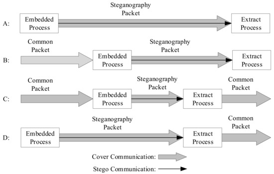 These four scenarios are all end-to-end communications. First of all, scenario A is similar to scenario D, with the secret information embedding and steganographic data packet being performed at the sender. The cover communication and steganographic communication are synchronized. Scenario A obtains the mystery information at the receiving end, but scenario D extracts the mystery message during the communication process, and the receiving end obtains the common data packet or the damaged data packet directly. In scenario B and scenario C, the cover communication is performed first, and then the common packet is embedded with secret information to form a steganography packet for transmission. The second scenario culls the secret information at the receiving end, and the third scenario culls the confidential information during the communication process, which is similar to scenario D.