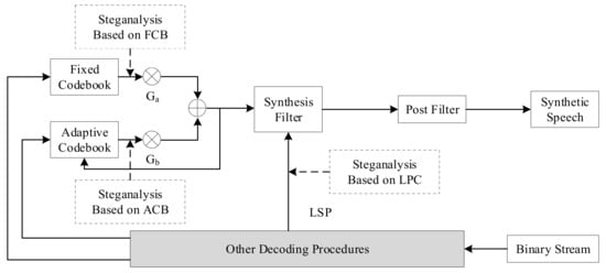 - Ren, Y.; Wang, L. An Overview of Steganography and steganalysis On CELP. Chinese Institute of Electronics Beijing Institute of Electronic Technology Application. In Proceedings of the 13th National Conference on Information Hiding and Multimedia Information Security, Hefei, China, 14–16 October 2016; pp. 53–61. [Google Scholar]