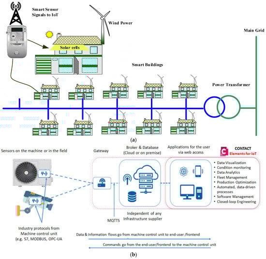 In this section, the IoT based architecture is described in detail since it is the main component of the proposed approach. Smart energy management can be utilized to decrease energy consumption in buildings, while simultaneously contributing to the comfort and security of the building. The building energy monitoring system presented in this work follows the general IoT architecture, which includes devices, connectivity, cloud, data acquisition, and application modules [23]. Multiple IoT devices of the system are equipped with electronics such as sensors and microcontrollers; they can integrate to perform a diverse set of processes. Specifically, sensors are used to sense the environment, then the collected data are transferred to the cloud through gateways for further computing. The data are analyzed in real-time and give the user complete control over the decision-making process. Once the decision is taken, then corresponding feedback is transmitted to the microcontroller on the system in order to turn on/off the units accordingly. An example of smart buildings that are interconnected to electrical power systems is illustrated in Figure 1a. Further, an IoT architecture for monitoring energy consumption is presented in Figure 1b, where the air conditioner control units inside these buildings are connected remotely to CONTACT Elements of the IoT platform. This platform allows the system to monitor devices in real-time. Data acquisition can be conducted through interfaces, such as the use of open platform communications (OPC), Modbus, and the message queuing telemetry transport (MQTT) network protocol. Although the data collection from devices can be implemented with various IoT platforms through edge computing and IoT cloud getaways, real-time process monitoring may be reflected by the choice of data acquisition relevant to the selection of relevant features, scaling and data filtering, data resampling, and dimensionality reduction of data [24]. An appropriate method, in each case, can be chosen depending on the nature of the process phenomenon. In this scheme, the CONTACT Elements for IoT@ [25], a complete platform from edge connectivity to business applications for customers via the web using a Digital Twin, is deployed to quickly evaluate the collected data and monitoring the devices intelligently. The CONTACT Elements for IoT uses standard MQTT protocols to visualize such information through a graphical dashboard after being processed by various signal processing and machine learning techniques.