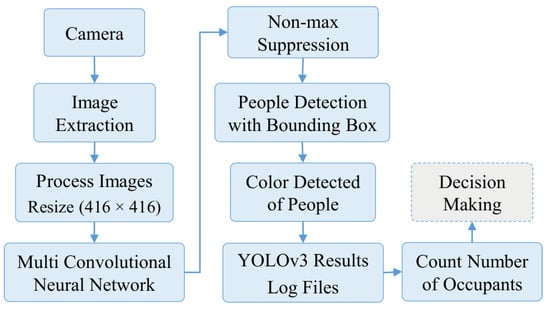 Accordingly, it is important to incorporate more advanced machine learning techniques to successfully collect, manage, and analyze data in real-time because of the restricted capabilities of the IoT devices for smart buildings. With the development of machine learning, deep learning is recognized as an effective tool that is able to achieve end-to-end learning patterns and highly non-linear relationships in data. The deeper architectures of deep learning technologies allow them to learn more complicated features than shallow ones. Their reliable training algorithms are capable of learning informative target features without the need to extract and choose the important features manually [17]. There is no doubt that deep learning was an excellent strategy for dealing with a nonlinear issue of stationary human recognition. The IoT platform with a machine learning-based energy monitoring system is a promising approach for monitoring smart buildings to reduce energy consumption and simultaneously remain comfort and safety [18]. In ref. [19], You Look Only Once (YOLO-v3) is reported as one of the best algorithms for object detection among deep learning techniques [19]. This model has been developed to increase the recognition speed in offline and real-time situations. However, objects appearing too close in the image, or the detection of small objects, represent some drawbacks of this algorithm [20]. The demonstration of YOLO by utilizing the Darknet deep learning library can cope with recognition issues. Furthermore, it achieves a state of the art for real-time object detection. Since the YOLO network can recognize targets in the image without the requirement of the region proposal network by directly performing regression, this allows YOLO to perform much faster detection. Recently, the state-of-art version (YOLOv3) has been used to attain higher precision, accuracy and speed and optimize for the detection of small targets [21]. The original YOLOv3 network optimized its anchors for the head tracking part; the detection accuracy of passenger flow density in a metro system reached 95% [22].