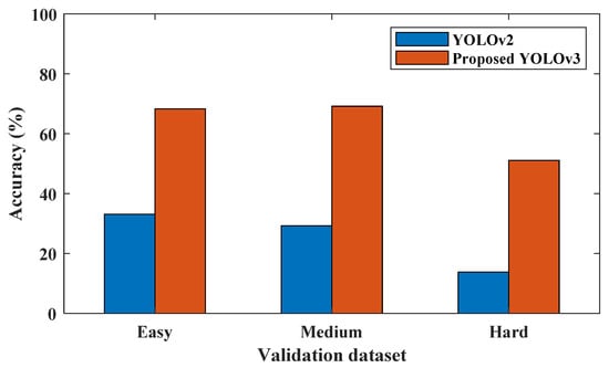 The accuracy of different YOLO algorithms in the case of easy, medium, and hard validation datasets.