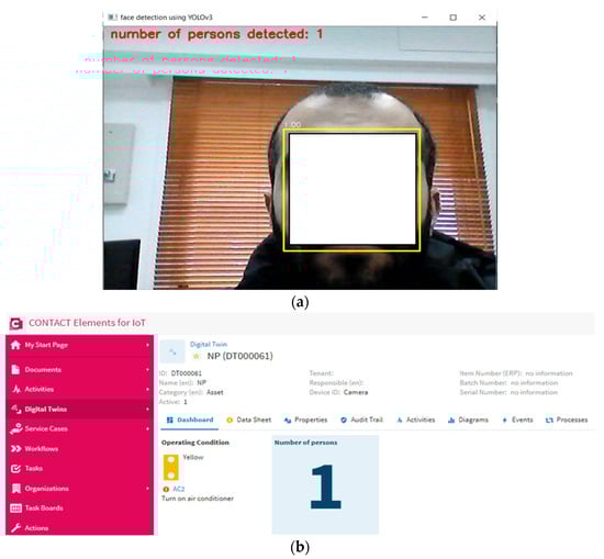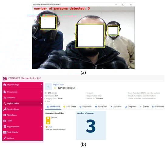 The number of persons detected in the case of scenario 3: (a) the output of YOLOv3 algorithm, (b) the presented output on the dashboard of the IoT platform.