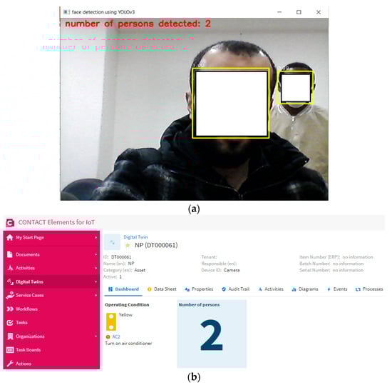 The number of persons detected—in this case, 2 persons: (a) the output of YOLOv3 algorithm, (b) the presented output on the dashboard of the IoT platform.