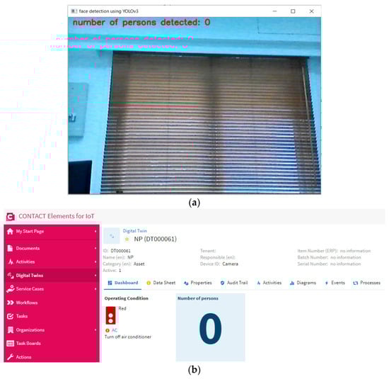 This scenario is performed to test the proposed IoT system in the case of no persons in the specified area. Figure 15 shows that the proposed YOLOv3 algorithm can detect that there are no persons in the specified area and send the number of persons equal to “0” to the IoT platform via the MQTT protocol. Then, the IoT finds that the number of persons equals “0”. In this case, the IoT platform sends a “0” signal to the microcontroller of the air conditioner in order to disconnect the power of the air conditioner, as shown in Figure 16. This result concludes that the proposed IoT system can disconnect the power of the air conditioner if there are no persons in a specific area. This IoT system can decrease the cost and energy consumption due to the air conditioner operation. In the future, the proposed approach will involve detailed modeling of IoT and smart energy systems, and it will also be applied in robotics applications towards the development of industry 4.0 [35,36,37,38,39,40].