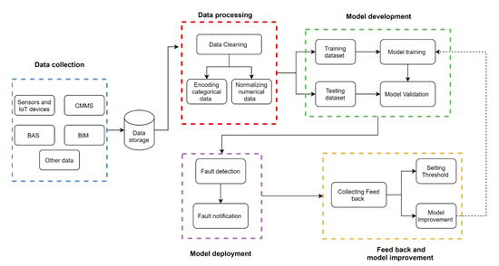 The proposed framework in Figure 2 represents a machine learning approach adapted to the building context. The framework is composed of five steps: data collection, data processing, model development, fault notification and model improvement. All the steps are discussed and detailed below.