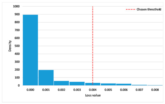 In order to build the training dataset, data were collected for a period of around 3 months. The predictive model used in this case study has the same architecture presented in Section 4.4.1. The root mean square error (RMSE) was used as an anomaly score (Section 4.4.2). Following this, the alert threshold was in accordance with the user to limit the number of alerts below an acceptable number. As a result of this process, the threshold was set to 0.0040, considering that the anomaly score (RMSE) varies from 0 to 0.0125 (dimensionless measure), as illustrated in Figure 6.