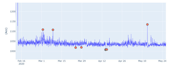 For instance, Figure 7 illustrates the anomalies detected in “Boiler 2”. The anomalies are projected on the vibration graph of “Boiler 2”, where the x-axis represents the time, and the y-axis represents the vibration (unit: ).