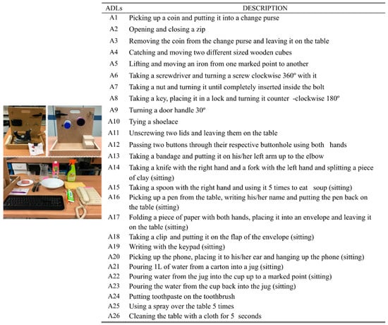Kinematic data from the publicly available KIN-MUS UJI database [3] was used for the extraction of synergies. This section briefly describes this experiment (see [3] for more details). Twenty-two right-handed subjects participated in the experiment, whose mean ± SD age was 35 ± 9 years. The criteria used to select subjects were gender parity in the overall data, age between 20 and 65 years, and no declared upper limb pathologies. Subjects performed 26 representative ADL (Figure 1): 20 activities adapted from the Sollerman Hand Function Test (to ensure their repeatability and to favor their standardization), and six additional activities (A10, A15, A19, A24, A25, A26) that were added based on the percentage of use of the commonest grasps in ADL [42]. In order to foster repeatability, precise instructions for each task were provided and each ADL started and ended with the body and arms in the same posture (arms and hands relaxed at the side of the body when subjects were standing, or arms and hands resting in a relaxed position on the table when they were sitting). They performed each activity once and all subjects did them in the same order.