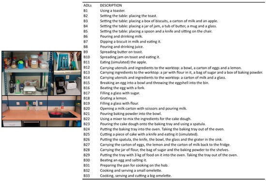 Experiment A: List of activities of daily living (ADLs) performed and scenario with the objects used. Unless indicated otherwise, the position of the subject was standing.