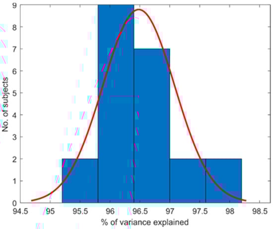 Ten PCs were extracted in all the subjects. The total amount of variance explained per subject is summarized in Figure 3 by portraying the subject distribution in a histogram. The histogram of variance explained for each subject shows the data at 96.48% ± 1.2%.