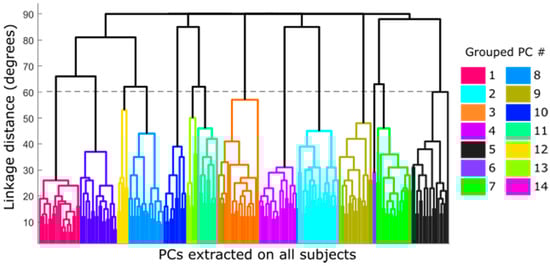 Figure 4 shows the dendrogram obtained from the hierarchical clustering algorithm of the whole dataset of PCs (220 extracted PCs = 22 subjects × 10 PCs). The different possible groupings, depending on the similarity between PCs according to their pairwise distances, have been plotted in colors. In this case, the minimum number of groups that ensures that no cluster contains more than one synergy from the same subject corresponds to a cut-off of 60 degrees as the pairwise distance (dotted line in Figure 4), which yielded 14 groups of synergies.