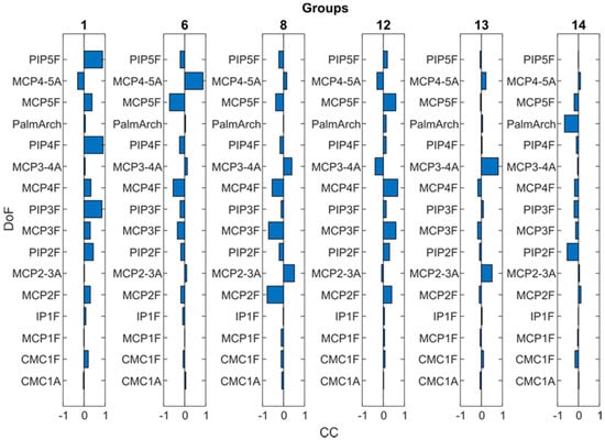 Table 1 describes the groups obtained and the predominant DoF of each group (those DoF with CC > 0.4). Six groups (2, 3, 4, 5, 7 and 9) showed a single predominant DoF with CC > 0.8 and this DoF did not appear coordinated with other DoF in other groups, and was therefore selected as the independent DoF that has to be measured (Table 2): CMC1A, CMC1F, MCP1F, IP1F, PIP2F and palmar arch. Although groups 10 and 11 (MCP3–4A and MCP2–3A) showed a predominance in only one DoF, they also appeared coordinated with other DoF in group 13. They were thus considered only as candidates to represent the coordination described afterwards (Table 2). The remaining five groups represented the coordination that exists between DoF (Figure 4): (i) PIP coordination (group 1), (ii) MCP coordination (groups 6, 8 and 12), and (iii) coordination between Palmar arch and PIP2F (group 14). This last coordination was discarded as it was present in only two subjects. The predominant DoF listed in Table 1 for the groups representing the two main coordinations between DoF (Figure 5: groups 1, 6, 8 and 12) were considered as candidates to represent them (Table 2).