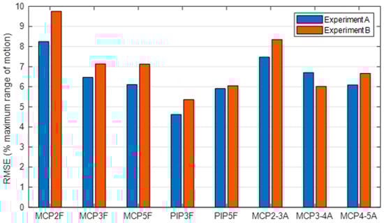 For a better comparison, Figure 7 shows the global RMSE errors expressed as a percentage with respect to the RoM of each DoF considering the angles for both experiment A and experiment B. All the estimated angles presented similar RMSE values, with RMSE errors below 10% of their maximum RoM. Note that the DoF with the highest error were those of the index finger. The lowest error was for flexion/extension of the PIP of the middle finger.
