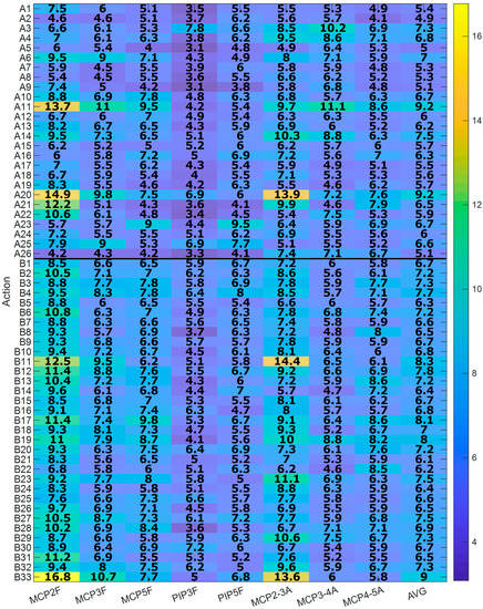 Figure 8 shows the global RMSE errors, expressed as a percentage with respect to the RoM of each DoF, per action and joint (computed from all frames and subjects of each action) for both Experiment A (A1–A26) and Experiment B (B1–B33). All the actions presented RMSE errors, on average, below 10%. For actions from Experiment A, those with the highest errors were “A11. Unscrewing two lids and leaving them on a table” and “A20. Picking up the phone” (AVG = 9.2%). The one with the lowest error was “A5. Lifting and moving an iron” (AVG = 5.0%). For actions from Experiment B, the one with the highest error was “B33. Cooking, serving and cutting a big omelette” (AVG = 9.0%) and the one with the lowest error was “B21. Pouring baking powder into the bowl” (AVG = 6.1%).