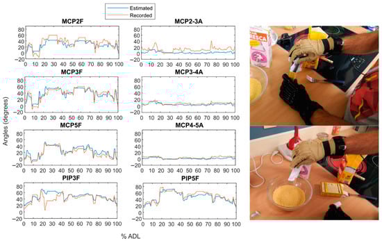 The method presented herein obtained similar errors in different datasets regardless of the type of complexity of the ADL to be performed. In experiment A, the ADL were more controlled and repeatable between subjects whereas in experiment B subjects had more freedom to carry out the activities, which were more complex and varied, since each of them involved several actions. In general, average errors obtained were below 10% of the RoM of each DoF, for all the activities and DoF. The estimations were performed with the hand movements of a few representative daily life activities (Experiment A) and were then applied to continuous and complex actions (Experiment B), involving reaching, grasping, and manipulation stages, with varied products and actions (beating, stirring, cooking, serving, cutting, etc.), as well as natural and free hand movements during those actions.