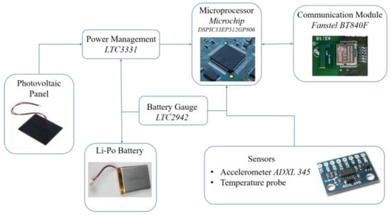 A specific circuit has been designed for on board energy management. The main function of this circuit is to supply the sensors, the microprocessor, and the wireless transmission system; the energy comes from the battery during the night and from the PV panel during daytime. Furthermore, the circuit stores the extra power produced by the PV panel (with respect to the load) into the battery. A functional scheme of the board layout is reported in Figure 2.