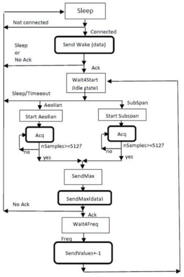The on board firmware has been specifically developed for this project and is divided between the two available processors, namely the sensor node microprocessor, whose role is to perform the computational work, and the CPU inside the BLE transceiver, whose task is to manage data communication. The node operativity is characterized by an optimized duty cycle composed by a sleep period and a working one. During the sleep time, which can be increased or decreased according to the monitoring requirements by modifying the node wake time value via software, the Microchip microprocessor is in a very low power mode while the communication module is put in a reset state. Under these conditions the power consumption is very low, as it will be shown in Section 3.1.2. The communication between sensor nodes and gateway is realized by means of messages exchange between the two devices. In particular, the state machine shown in Figure 4 represents the operations performed by WindNodes in one acquisition cycle in the specific case of wind-induced vibration monitoring on cables.