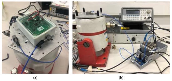 A shaker test was carried out in order to evaluate the measurement accuracy of WindNode through a comparison with a reference wired accelerometer (Figure 5a). A second reference accelerometer was used in order to verify the measurement chain, by detecting potential local modes involving the board and plastic enclosure. The test set-up is composed by a LDS electromagnetic shaker, a 33220A Agilent waveform generator, and a PA100E LDS power amplifier, as observed in Figure 5b. Data were acquired wirelessly from the WindNode, while in the case of the reference accelerometer a DAQ 9178 National Instruments was used. This test was performed by means of a frequency sweep and a few acquisitions were carried out for each considered frequency.