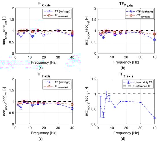 Shaker test results: (a) X axis transfer function; (b) Y axis transfer function; (c) Z axis transfer function; and (d) uncertainty estimated by means of error bands for each considered frequency [1] © 2020 IEEE.