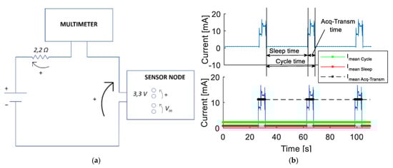 The second laboratory test regards the verification of the sensor node power consumption during the working phase, since this feature represents a key point in the design of the device. Apart from minimizing the power consumption of the electronic components during the acquisition and transmission phases, the design optimization was performed by implementing a sleep mode between two consecutive measurement operations. Consequently, it is possible to obtain a lower mean power consumption by increasing the WindNode sleep time and this operation can be executed through the acquisition software. The obtained duty cycle is in line with continuous monitoring of civil and mechanical structures and allows to gather a proper amount of data with a reasonable autonomy in case of no solar light hitting the PV panel. The test set-up is represented in Figure 7a. The performed simulations allows to collect consumption data, represented in Figure 7b in terms of current consumption (blue line) of a working WindNode characterized by a 30 s wake time duty cycle [1].