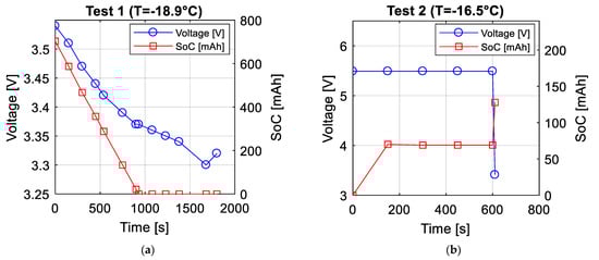 Temperature test: (a) Battery voltage and SoC (State of Charge) trends when battery is discharging (Test 1) and (b) battery voltage and SoC trends when battery is recharging (Test 2).