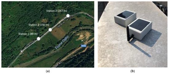 Communication range test in urban scenario: (a) Map of the test area [1] © 2020 IEEE and (b) positioning of master board and sensor node during the test.