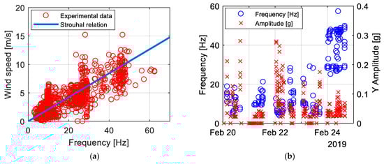 As already explained, data output coming from WindNodes are in the form of vibration amplitudes and frequencies, thanks to the ability of performing the FFT of the acquired acceleration signal on board. In this way, synthetic and significant data are already available to be analyzed once received by the WindNodes. In the case of conductors, acceleration values correlate with wind data acquired by an anemometer in order to understand what kind of wind instability is affecting the line. Some data acquired from WindNodes during the Manitoba field test are shown in Figure 12a,b. In particular, in Figure 12a it is clearly visible that the detected frequency values in the range 5–50 Hz are in accordance with Strouhal formula. The accuracy of the sensor node allows one to detect acceleration amplitudes starting from the MEMS accelerometer amplitude resolution up to 0.4 g, as it can be appreciated in Figure 12b [1]. In accordance with the explained physics of the problem, the higher amplitude values correspond to low frequencies, while for relatively high frequencies (30–50 Hz range) the lowest amplitude values are observed. Data acquired during this experimental campaign on a real structure have proven the good performance of WindNode in the field of continuous monitoring of a vibrating structure.