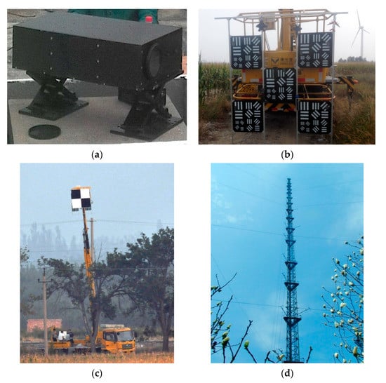 (a) Φ80 mm diffractive membrane camera. (b) Bar target loaded on the overhead working truck. (c) Work scene of using the overhead working truck and (d) the meteorological tower for loading the diffractive membrane camera (DMC) during the ground experiments.