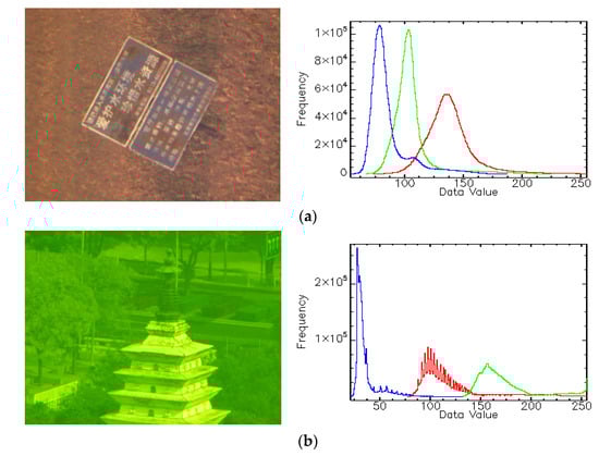 During the ground experiments, more than 20,000 diffractive images were obtained with various imaging parameter settings. Basically, the obtained diffractive images can be divided into two categories: The images of artificial targets (including various bar and resolution targets, toy models, and printed images) and the images of natural scenes (random scenes around the experimental site). Based on these image data, the imaging quality of the DMC was assessed using the spatial resolution, the modulation transfer function (MTF), and the signal to noise ratio (SNR), etc. Numerical results indicate that the image degradations appear in the single-band DMC images, which are expected and similar to the MOIRE mission [9]. Previous studies have suggested various empirical and physical-based restoration methods for diffractive images [14,15]. After implementing certain restoration approaches to the degraded single-band images, we found the qualities of DMC images basically meet the mission requirements in terms of the spatial resolution, the MTF and the SNR. However, due to the missing of chromatic aberration correction system of the DMC, serious color distortions are observed in the color diffractive images. As interpreted previously, this is resulted from the spectral distortion of diffractive primary and the wavelength correlation of atmospheric scattering. The chromatic aberration can be up to larger than 60%. Particularly, in the third ground experiment, because of the misuse of optical filter, all produced images present greenish color. Figure 2 shows two color distorted images obtained in ground experiments and the corresponding histograms. It is seen that the RGB histograms remarkably disperse in the grayscale. Notably, in the third ground experiment, because of the misuse of optical filter, all produced images present greenish color. Therefore, such color deviations can be seen as the superimposition of artificial distortion and inherent chromatic aberration of diffractive imaging. The greenish distortion has dependency of imaging circumstance which cannot be systematically removed. In addition, the atmospheric scattering and relatively low diffraction efficiency also cause the hazing effect of images so that the image visual quality would be diminished. Therefore, it is significant to perform color restoration to the diffractive images before remote sensing applications.