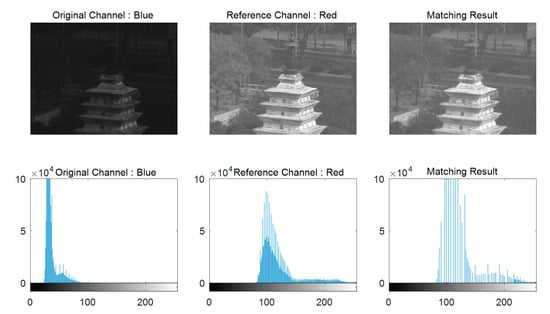 Figure 3. Histogram matching between channels of the diffractive image with chromatic aberration. - Tailor and non-linearly stretch the histogram of each channel usingwhere and denote the DN of pixel at of original and restored images for the corresponding channel. and are the bottom and top DN cutoffs which are generally determined by the cutting percentage between 0.01% and 2%. Here the cutting percentage is defined as the number of pixels with DN smaller than and larger than divided by the total pixel numbers. Thus, the DN cutoffs can be given by the gray cumulative histogram for a specific cutting percentage. For the non-linear histogram stretching of the tailored histogram between DN cutoffs, we follow [34] and use the quadratic transformation function to stretch the histogram, which is described as followswhere denotes the new DN value after gray transformation. α, β and γ are the coefficients which can be computed followingwhere is the mean DN value of corresponding channel. is the brightness weight which is selected at 0.4 in this study.There are two reasons to account for the process of histogram tailoring and stretching. Firstly, in the previous step of histogram matching, the image noise of the matching channel could be enlarged by matching to the reference channel. Those noise signals typically have extreme values. Thus, histogram tailoring at the two ends of grayscale histogram would be conducive to suppress the noise. Secondly, implementing the histogram tailoring also aims to improve the image contrast and definition to remove the hazing effect. From (7), it is noted that both histogram tailoring and stretching depend on the bottom and top DN cutoffs of histogram, i.e., and . The selection of the DN cutoffs determines the final color restoration effects. Theoretically, removing the hazing effect would increase the image depth of filed so that the image information would be increased. However, on the other hand, too much histogram tailoring would reduce the image information. Thus, the basic principle of selecting the histogram cutoffs is to reduce image noise and enhance the contrast to largest extent with losing less image information. As a result, we repeatedly perform histogram tailoring and non-linear stretching with various cutoffs to obtain the image with maximum information. The initial cutting percentage is given as 0.01%. Particularly, the information entropy (IE) is employed to evaluate the image information and be a stopping criterion. The IE is defined as [35]where denotes the probability of grayscale i, which can be calculated from the image histogram (see (5) and (6)) as followsBy repeatedly performing this procedure of histogram tailoring and non-linear stretching using various cutting percentages in a grid one by one, the image with largest IE would be obtained. The corresponding cutting percentage can be used to remove noises but retain the useful information. The detailed algorithm of histogram tailoring and stretching is described as follows (Algorithm 1).
