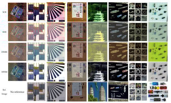 In Figure 4, the proposed HMTS algorithm is implemented to the color distorted DMC images. The results are also compared to those using the GWA, the PRM, the WPR, the RAWB, the SCB, the IWB, and the DWBE. In particular, the auto white-balance correction module in the IWB was practically utilized. The DWBE was trained on the dataset which is available on http://cvil.eecs.yorku.ca/projects/public_html/sRGB_WB_correction/dataset.html (accessed on 1 February 2021). To comprehensively assess the performances of various methods in restoring the chromatic aberration of diffractive images, total 8 test diffractive images are used which involve all three ground experiments. For a fair and objective evaluation, we also present the corresponding reference images. However, for the test image 1 (warning board in the field) obtained in the first experiment, the reference camera unfortunately failed to follow up and capture image. In addition, as introduced in Section 2, due to the limitation of experimental environment, very few reference images were synchronously obtained in the third ground experiments. Thus, for those diffractive images with no reference images obtained, we used other images to show the original color of targets. Notably, the reference image is the digital image for printing, in which the colors are slightly different from those in the printed target for imaging. Table 1 presents the MDI and HOA indexes of original images and color restored images using various algorithms, which are presented in blue and red, respectively. Particularly, for the convenience of evaluation and discussion, the smallest two MDIs and the largest two HOAs are emphasized in black bold in Table 1.